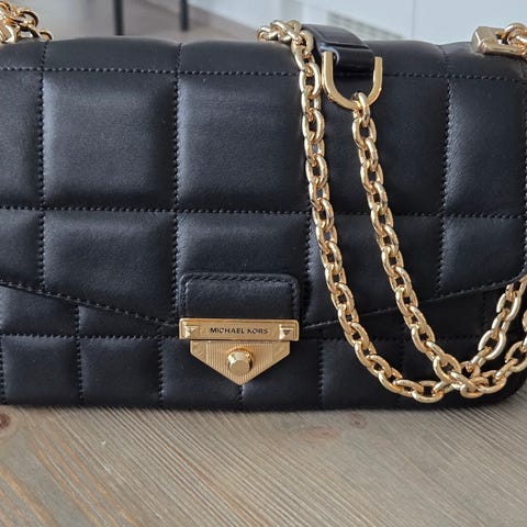 Kullanväriset metalliosat ja ikoninen MK-riipus viimeistelevät ylellisen ilmeen. Laukussa on irrotettava ja säädettävä olkahihna, vetoketjukiinnitys ja useita sisätaskuja.