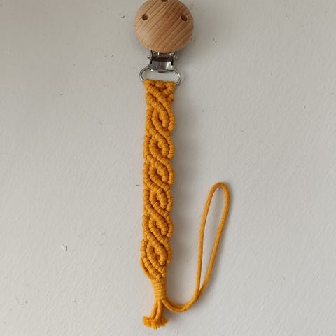 itse virkattu tuttiketju. toisessa päässä silikoninen rengas, joka kiinnitetään tuttiin, toisessa päässä klipsu, jolla saa esim vaatteeseen kiinni. lanka on pastellin keltainen 100% mers. egyptiläistä maco puuvillaa.
