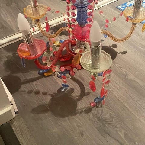 Viiden sakaran kattokruunu. Poistettu katosta toimivana. Liitäntä sokeripalalla.