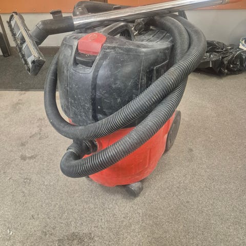 Tehokas märkä-kuivaimuri, Kärcher WD4 Premium. Suulake puuttuu ja pala irronnut muovipaneelista, mikä näkyy kuvassa, mutta ei vaikuta toimintaan.