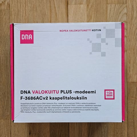 DNA F-3686AC V2 modeemi, valkoinen väri, mukana verkkokaapeli. Valokuituverkoille antennijohdolla.