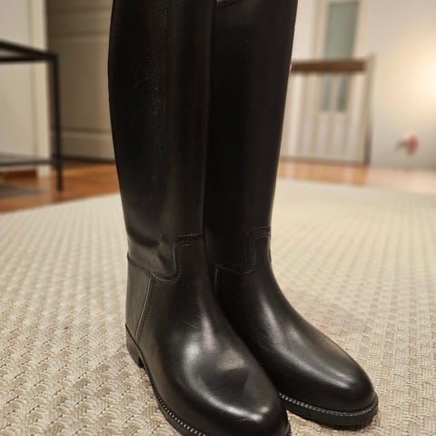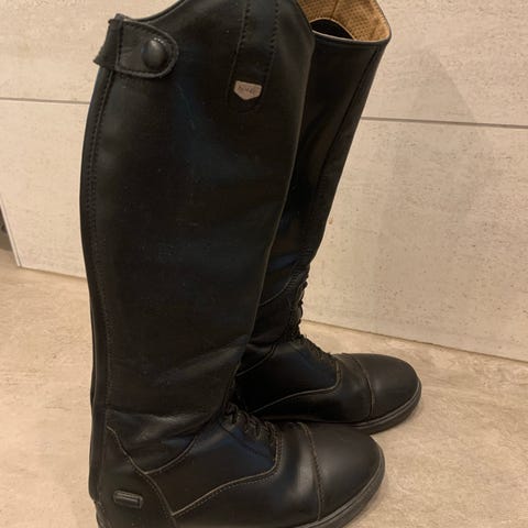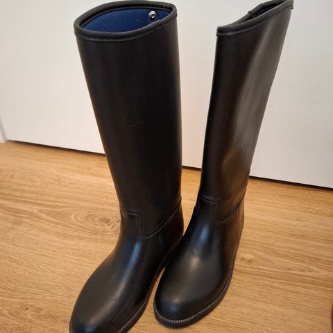 Lasten ratsastussaappaat, koko 34. Pohjallisen mitta 22.2-22.3cm. Saappaissa on korkea varsi, sopivat kosteisiin olosuhteisiin.