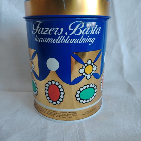 Vanha Fazerin peltipurkki. Kunto kohtalainen. Muovinen kansi tallella, pieni halkeama kannen sivussa.