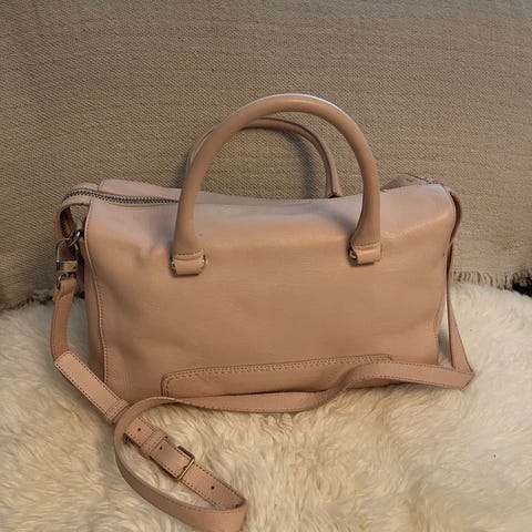 Naisten käsilaukku, vaaleanpunainen ulkopinta ja ruskeat kädensijat. Laukku on valmistettu nahasta.