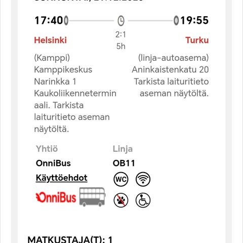 Onnibussi pöytäpaikka Hki 11.20 - Jlä 14.50 keskiviikko 29.10. 2025