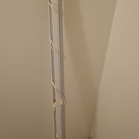 Valkoinen sälekaihdin, jonka leveys on 100 cm ja korkeus 156 cm. Pinta-asennettava. Materiaali puuta tms, ei metallinen (paitsi yläkisko).