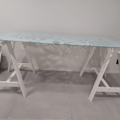 Lasipöytä pukki jaloilla. Käytön jälkiä löytyy. Mitat ei ihan tarkkoja