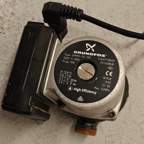 Toimiva grundfossin älyllinen kiertovesipumppu. Voidaan käyttää manuaalilla tai sitten automaatilla, jolloin säätää tehoa paineen mukaan.