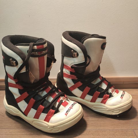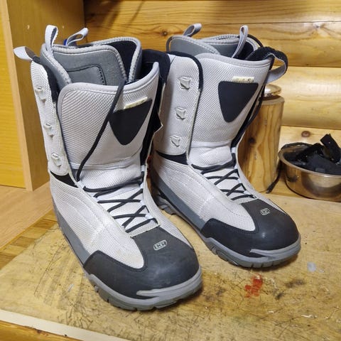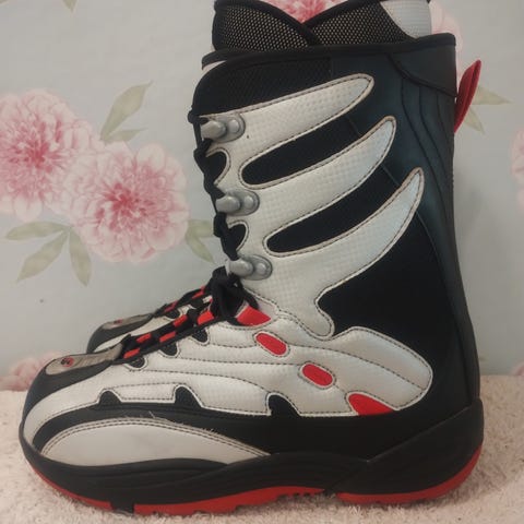 Crazy Creek lumilautakengät koko 44 (US 10.5, UK 9.5, JPN 28.5). Värit valkoinen ja musta. Valmistettu Kiinassa. Kenkien materiaali ja rakenne soveltuvat lumilautailuun.