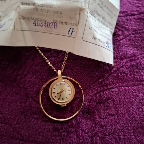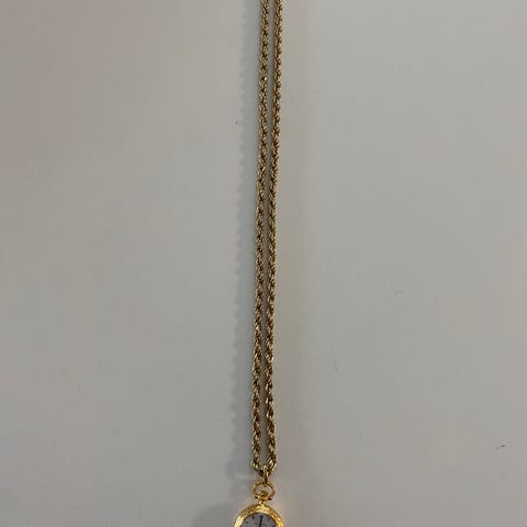 Kullattu kaulakello, jossa kullattu materiaali ja ketju. Kellossa on koristeellinen takakansi.ketjun pituus 80 cm