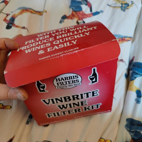 Suodatin, letkut ja kaikki kuvassa näkyvät mittarit ja viinipullon korkit sekä käyttöohje.