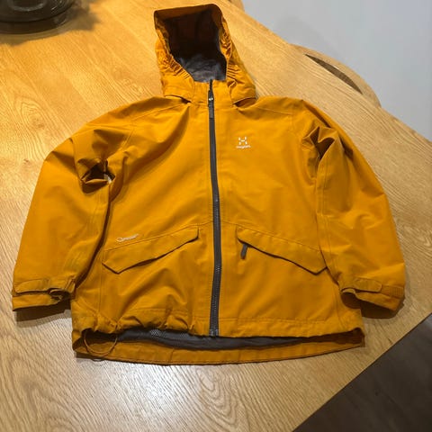 Hyväkuntoinen Haglöfsin kuoritakki, keltainen ja koko 152 cm.