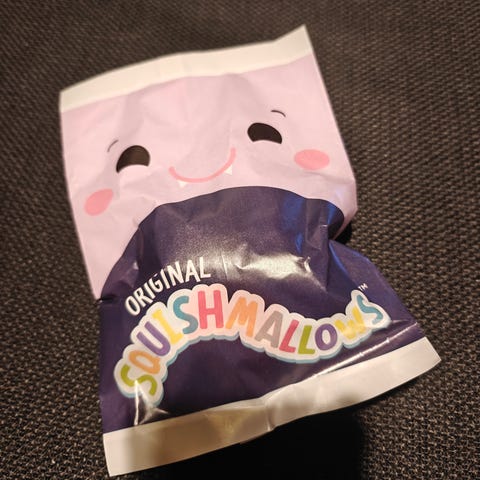 Happy meal mäkkärilelu Squishmallow pehmo avaamattomassa pakkauksessaan.