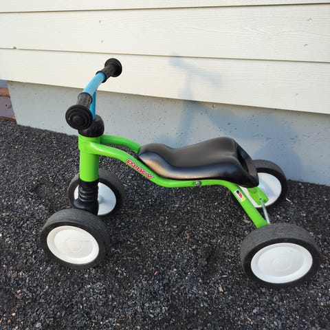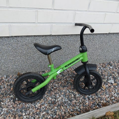Pikkuinen, kovassa käytössä ollut toimiva potkupyörä.