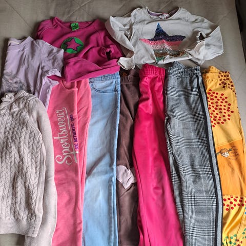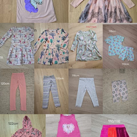 Pääasiassa hyväkuntoinen vaatepaketti. Kuvateksteissä lisätietoja. Meillä olleet käytössä 116-122cm.