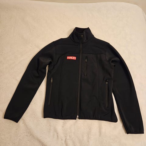 Halti StormWall softcell takki. Veroketju edessä, vetoketjulliset taskut ja ”tuuletuskainalot”. Harmaa fleecevuori.