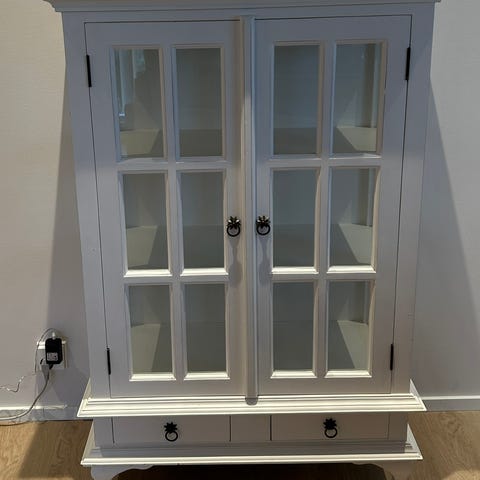 Kuvan vitriinikaappi myynnissä. Astiat eivät kuulu hintaan