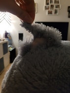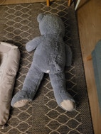 Kuvissa näkyy saumoista auenneita kohtia, toinen korva ja häntä revennyt.