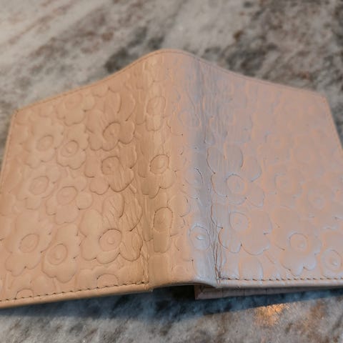 ”Pikkuinen Unikko -kuosilla kohokuvioitu nahkalompakko suljetaan kauttaaltaan vetoketjulla. Lompakossa on kaksi pääosastoa, useita taskuja ja korttilokeroita.”