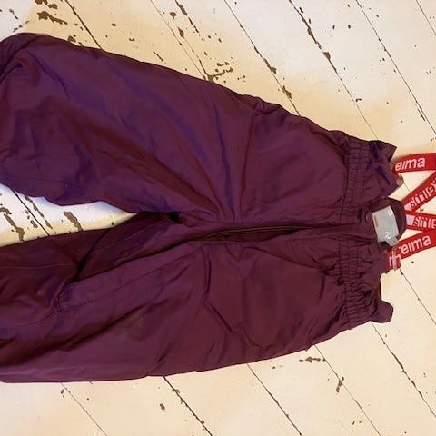 Upea violetti kaksiosainen talviasu pienelle tytölle kokoa 80 cm. Väri mielestäni vaaleanpunaiseen taittuva. Takissa irrotettava huppu, housuissa säädettävät henkselit, lahkeeseen asti ulottuva vetoketju edessä sekä kumiset kengän alle tulevat lenksut. Puvun hinta uutena 124 euroa.