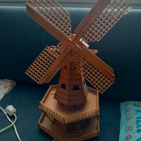 Tuulimylly, jossa valot. Soi kun veivaa lapoja. Korkeus 27 cm.