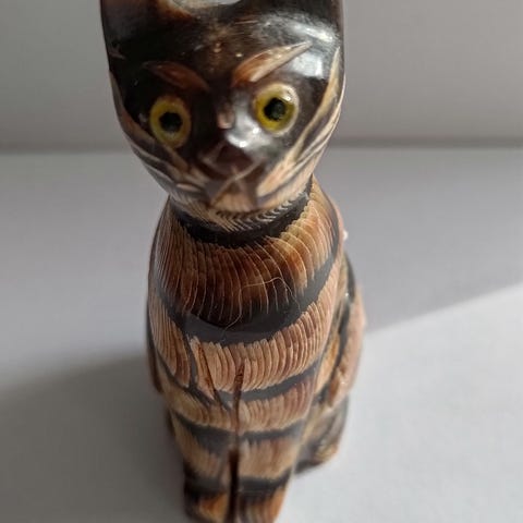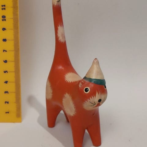 Puinen kissa. Korkeus 22 cm häntä mukaanlukien.