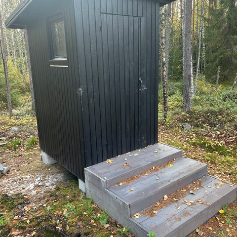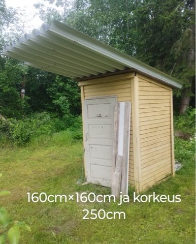 kevyt siirrellä. Ikkuna toisella kyljellä valoa tuomaan. Musta palahuopakatto joka on irroitetettavissa elementtinä. Puucee, puutarhavaja