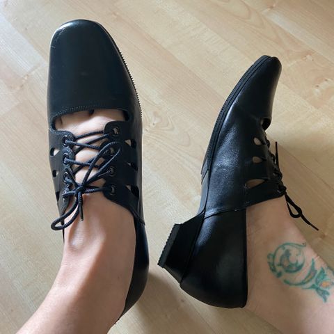 Kuvien vanhat, siistit ja ehjät naisten matalakorkoiset, mustat nahkakengät.