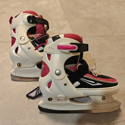 Valkoiset kaunoluistimet, joiden pohjassa lukee 35, ilmeisesti koko. Luistinten kunnosta ei ole tarkempaa tietoa. Joitain käytön jälkiä on näkyvissä. Luistinten sovitus on mahdollista noudettaessa. Ne saa hakea 0,2 eurolla.
