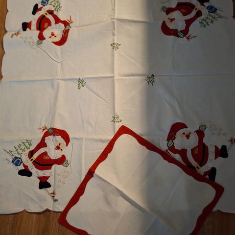 Jouluiset tuolinpäälliset 5 kpl ja pöytäliina 1 kpl . Yhdellä tuolinpäällisellä on pieni vaurio, joka halutessa on mahdollista korjata ompelemalla.