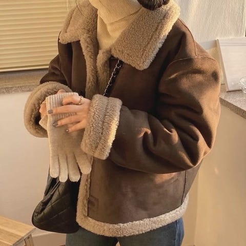 Abercrombie & Fitch Muu takki ruskeana, koko S. Takissa on pehmeä vuori ja koristeellinen karvareunus. Materiaalina on todennäköisesti keinonahka tai mokkanahkaa muistuttava kangas. Takki on suunniteltu naisille.