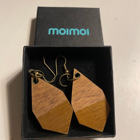 Moimoi merkkiset korvakorut eteenpäin. Olleet aikansa käytössä, mutta jääneet viime vuosina käyttämättä. Siistissä kunnossa, toisessa korussa pieni kuluma kärjessä.