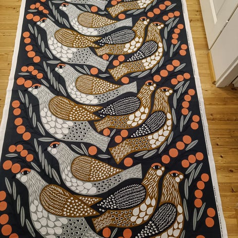 Myyntiin Marimekon paksua puuvillakangasta, joka kahtena pitkänä verhona tällä hetkellä. Värinä on valkoinen ja petroolinsininen. Kuvat vääristää sävyä, netistä lainatussa kuvassa oikeampi sävy. Tähän väriin ei törmää joka paikassa. Kangas on kahtena verhona, joiden pituus nyt ommeltuna 240cm. Alakäänne kevyesti piilo-ommeltu, joten helppo purkaa. Sivuja ei ole ommeltu, kuten kuvasta voi nähdä. Ylhäällä lisäksi leveä ripustusnauha. Kangasta ei ole pesty eikä se ole haalistunut.