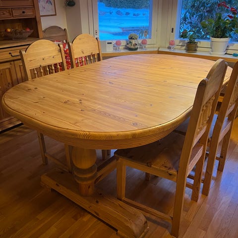 Massiivipuinen ruokailuryhmä, jossa jatkettava pöytä ja neljä tuolia. Jatkopalan mitat 57 cm x 95 cm. Pöydän ja tuolien pinta hieman tummentunut ajan myötä ja pieniä käytön jälkiä löytyy, muuten siisti ja ehjä kokonaisuus. Pöytä ostettavissa myös erikseen.