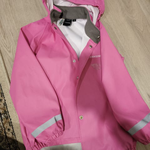 Tämä takki on erinomainen välikausiin ja sadepäiviin! Materiaali on vedenpitävä. Takissa on heijastimet hihoissa (kuten kuvassa näkyy).