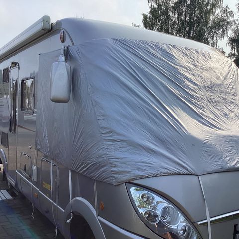 Matkailuauto suojapeite harmaa väri, suunniteltu suojaamaan ajoneuvoa sääolosuhteilta. Materiaali kestävää ja säänkestävää kangasta, sopii ulkokäyttöön. Sopii erikokoisille matkailuautoille, kuvassa oleva matkailuauto on 7,5 m pitkä, suojaa likaa, sadetta ja auringonvaloa vastaan.