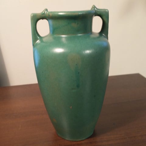 Vanha vihreä suuri savi vaasi. Korkeus 23,5 cm, leveys n. 16 cm.