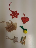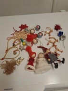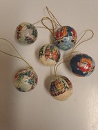 Paperimassaisi maalattuja joulukuusenpalloja zekä muita kuuseen ripustettava koristeita