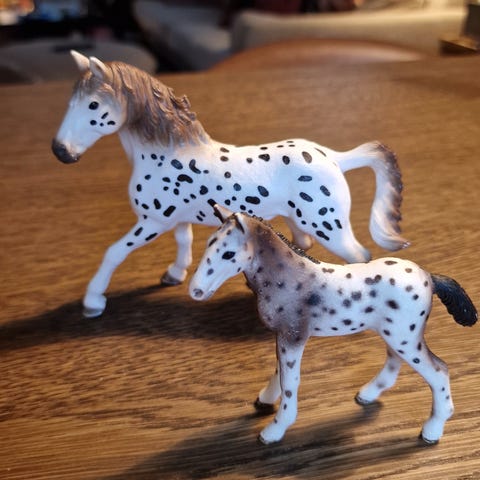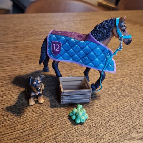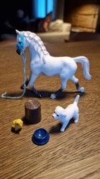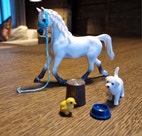 Hevonen, koira, tipu, kanto, riimu ja ruokakuppi settinä.