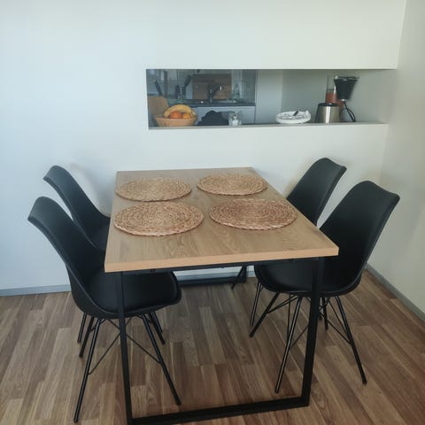 Tuoleissa käytön jälkiä, sekä pöydän pinnassa pieni jälki.