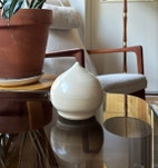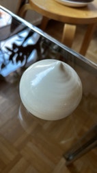 Paperipaino ja koristefuguuri. Pyöreä muotoilu, sopii sisustuselementiksi tai koriste-esineeksi. Materiaali keraaminen, väri valkoinen.
