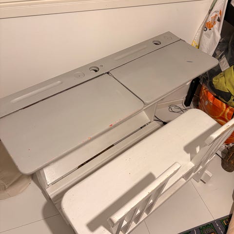 Lasten kahdenistuttava pulpetti leveys n 109cm . Muuten on hyvässä kunnossa mutta lapsi laittanut tarroja kanteen. (En ole koittanut poistaa niitä)