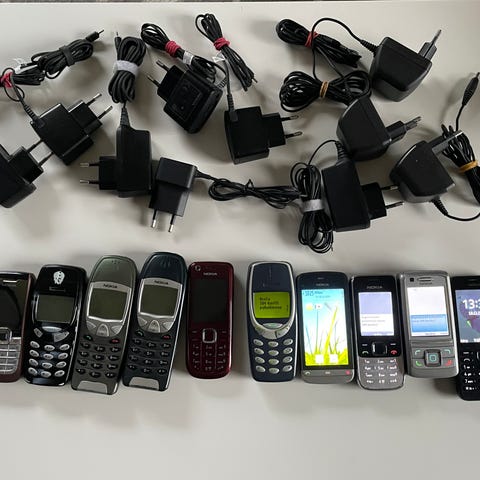 Kaksi toimivaa vanhaa Nokian puhelinta ja yksi kappale Nokian "isopäinen" laturi. Ulkopinnassa puhelimissa kulumaa mutta toimii ja akkukin kestää vielä ainakin useamman päivän testikäytössä.