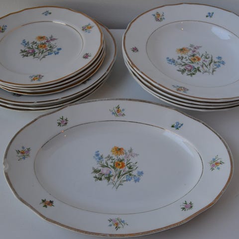 Arabia Hilkka-Liisa -sarjan posliininen astiasto, jossa on kukkakuvioita. Setti sisältää 4 kpl leipälautasia, 5 kpl ruokalautasia, 3 kpl tarjoiluastioita, 2 kpl syviä lautasia sekä kannun. Astioissa käytön jälkiä, kannussa lohkeama ja värjääntymiä.