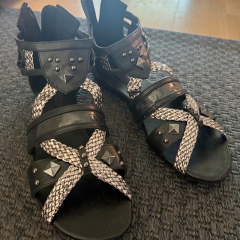 Myynnissä mustat niittikoristellut sandaalit, matalapohjaiset, koko 38, vähän käytetyt. Hinta 20 euroa + postikulut