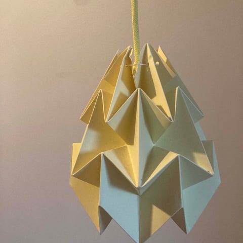 Mothin kartonkinen origami-valaisin, harmaa johto. Myydään tarpeettomana, ei sisällä itse lamppua (tähän käy E27/8W). Mitat noin 20x20cm.
