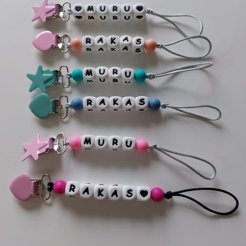 Myydään "Tähti" tuttinauhoja ihanissa värisävyissä. Tehty standardien mukaisesti. Materiaalina puuhelmet, silikonihelmet, puuklipsit sekä pehmeä satiininyöri.