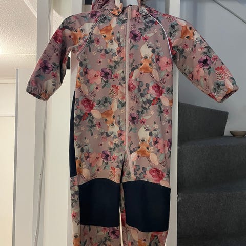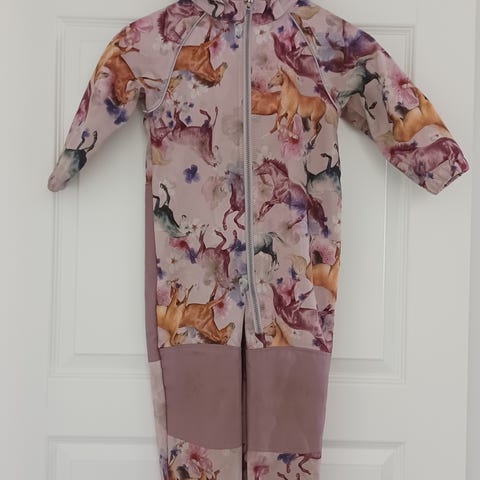 Name it softshell haalari. koko 98. Väriltään vihreä, jossa on maastokuviointi ja vahvistetut polvet.