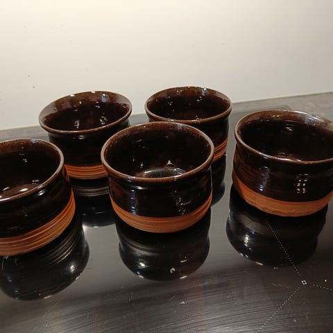 Käyttämättömät Kyyrölän saven kulhot, valkosipuliraastin/kastikekulho ja kauhanpidike.