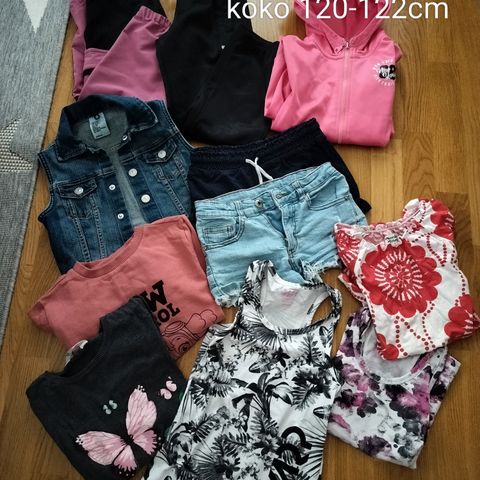 Kolme pussia sisä - ja ulkovaatetta ja yhdet tossut. Osa kulki meidän läpi käyttämättä kun tyttö venynyt pituutta. Enimmäkseen 122cm mutta hajakokoa alaspäin löytyy etenkin mekoista 110/116 ja esim sininen kukallinen takki on 128. Vain nouto. Kissatalous:)